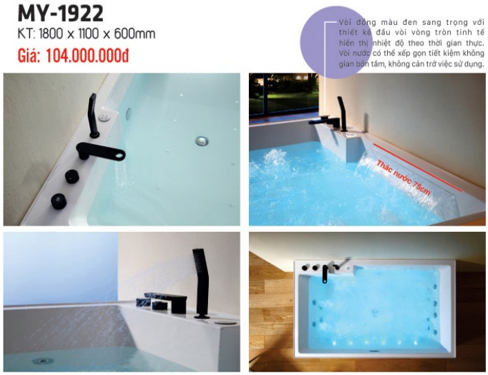 - Bồn tắm cao cấp massage kassani MY-1922 được chế tác độc đáo, chất liệu nhựa acrylic, thiết kế kiểu dáng hiện đại tạo không gian phòng tắm sang trọng bền vững theo thời gian, bề mặt sáng bóng, dễ lau rửa, không bong tróc cho bạn thoải mái sử dụng trong thời gian dài.